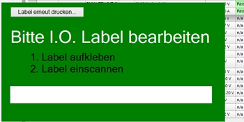 Ist der Test eines Bauteils abgeschlossen und das Bauteil wurde als i.O. bewertet, wird am Labeldrucker ein Etikett mit dem Pass-Label gespendet. Es erscheint ein Hinweis am Bildschirm was weiter geschehen soll. Nachdem das Etikett nach Vorschrift am Bauteil angebracht wurde, wird mit dem Handscanner der darauf befindliche 2D Code gescannt. Der Dialog erwartet die Scannereingabe in der weißen Eingabezeile.