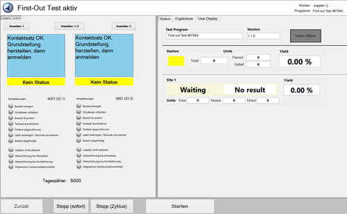 Mit dem Hochfahren in den Testbetrieb wird das ausgewählte Produktionstestpaket mit der entsprechenden Ausführvariante (Systemcheck, Produktionstest) gestartet.