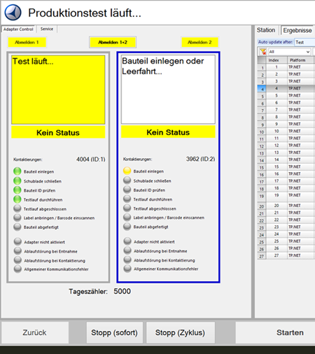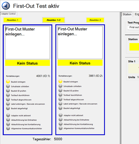 • Im mittleren Bildschirmbereich befindet sich die Visualisierung der Adaptersteuerung und es werden Status und Ergebnisses des Testbetriebs dargestellt